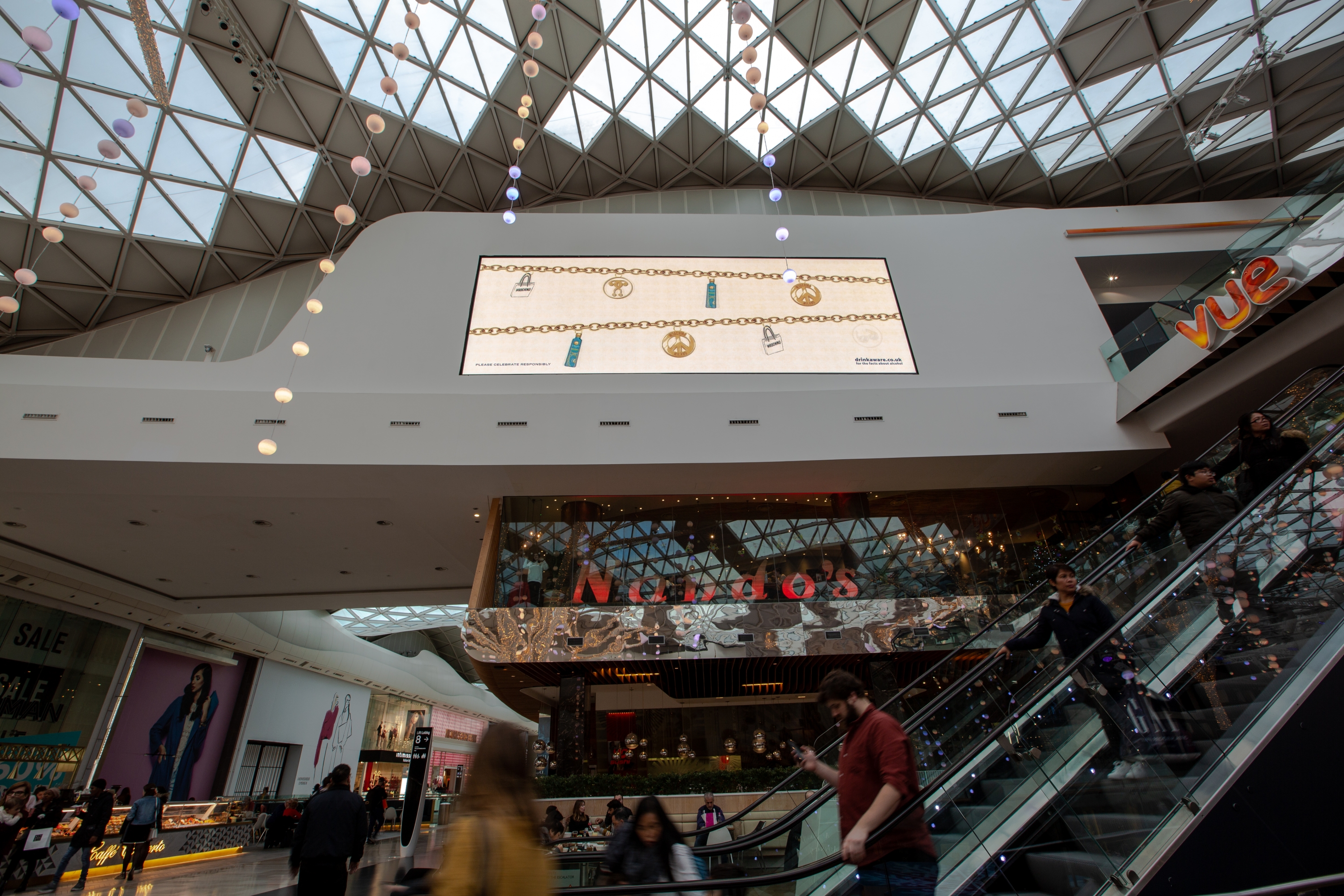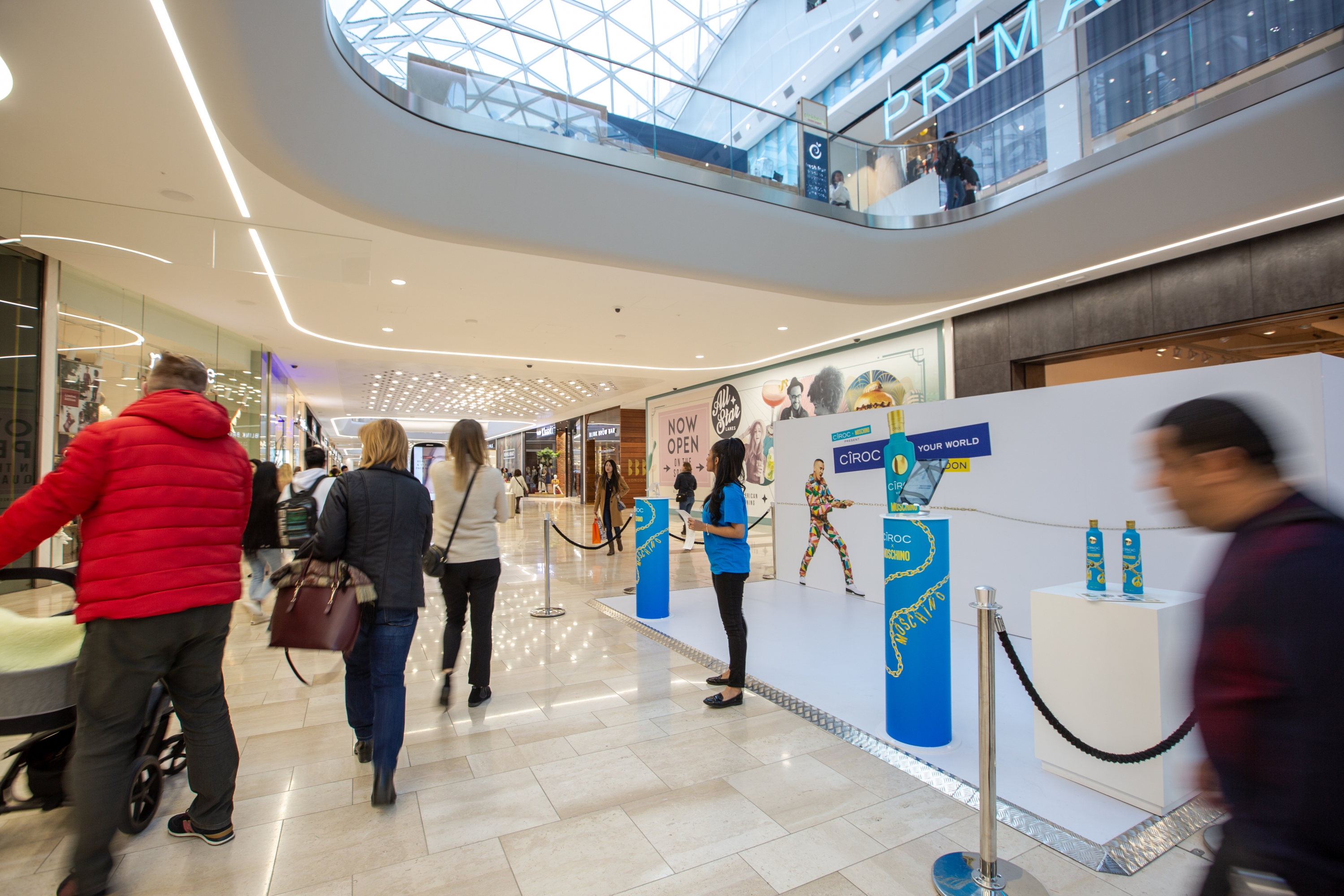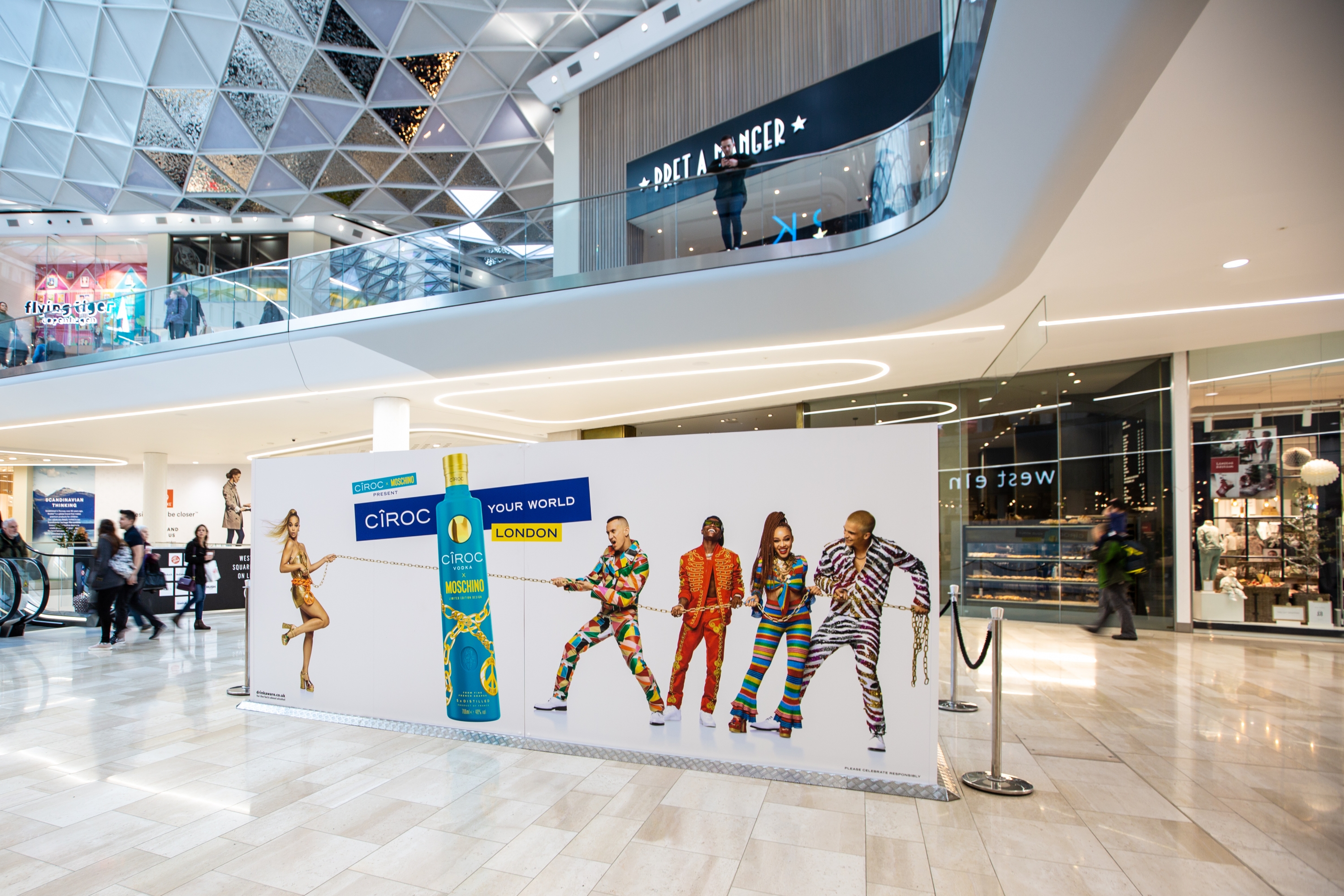 To promote the release of Cîroc’s limited edition x Moschino Vodka bottle, an experiential area within Westfield London invited shoppers to personalise their own. The designed templates were then displayed across digital landscape screens in the mall.