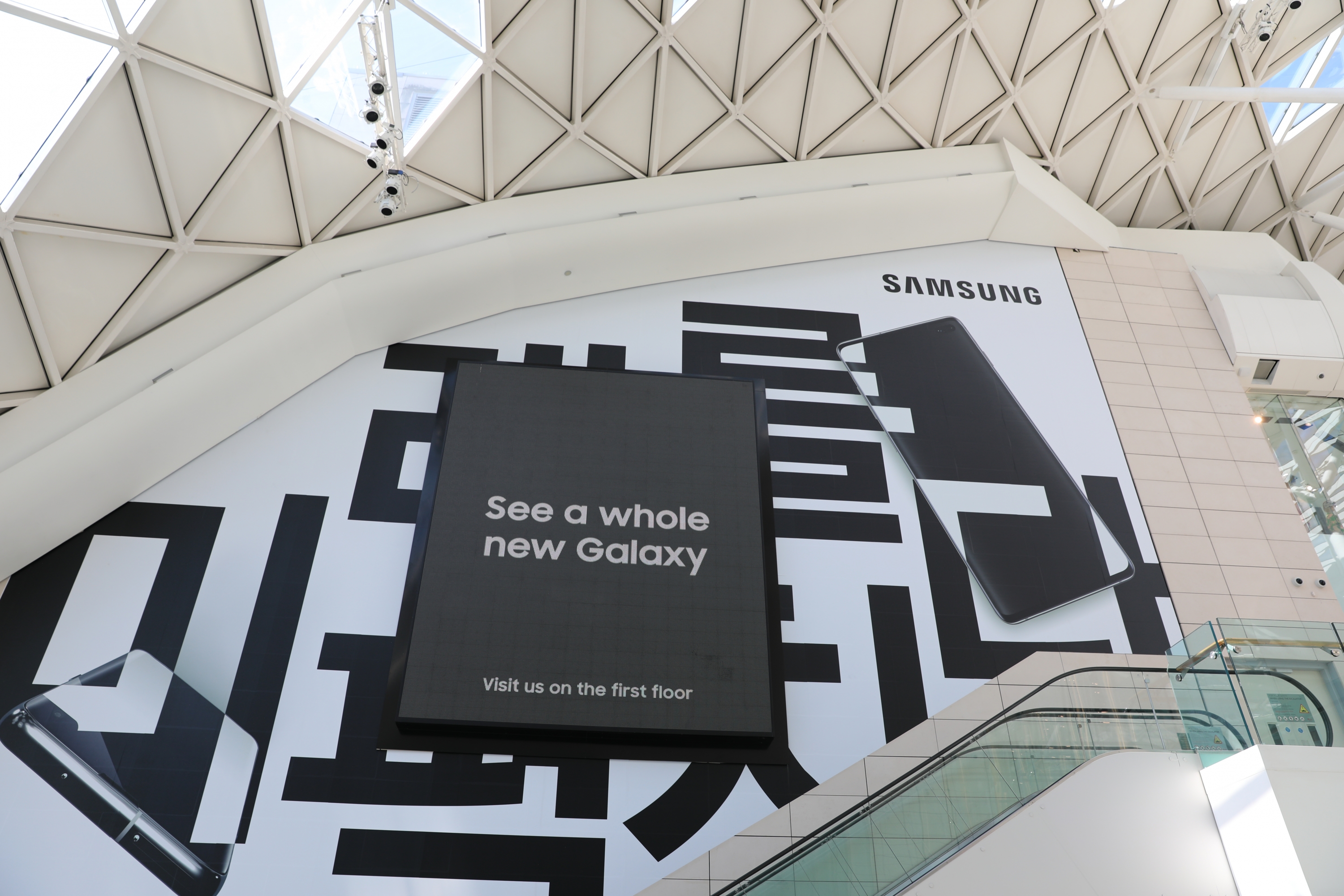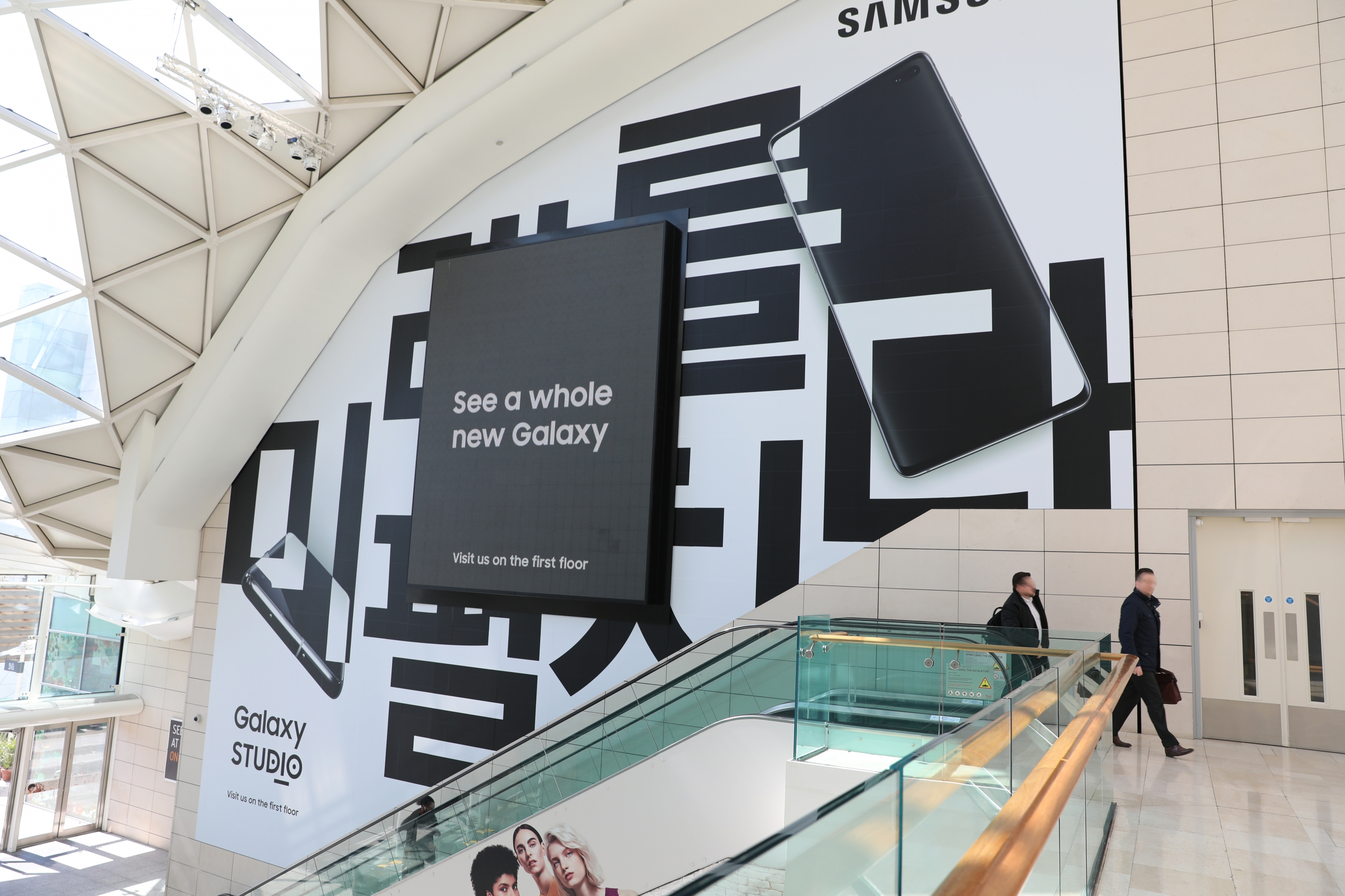To celebrate the release of the Galaxy S10, Westfield London's Atrium Landmark was transformed. This unmissable vantage point was covered in contemporary black and white vinyl. The M–Vision screen invited shoppers to visit in-store and experience the product for themselves.