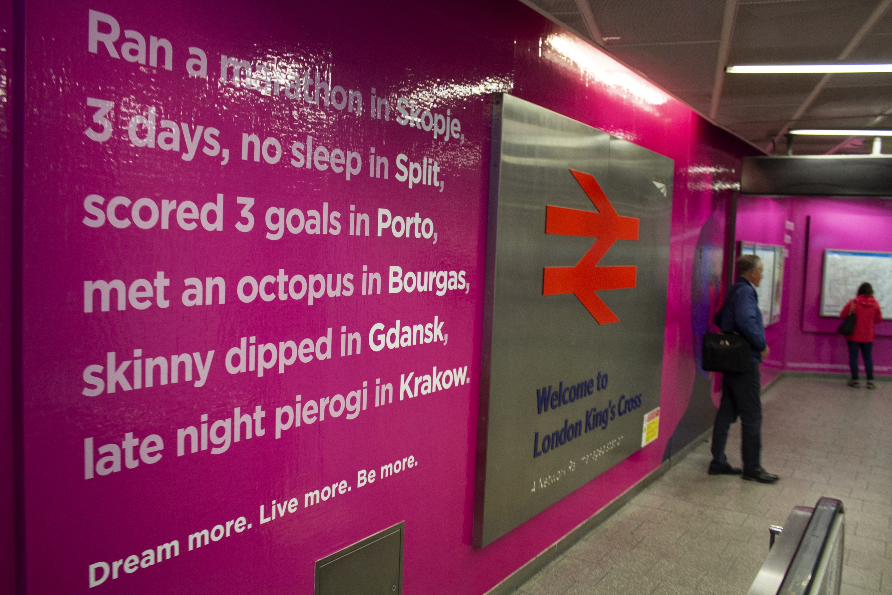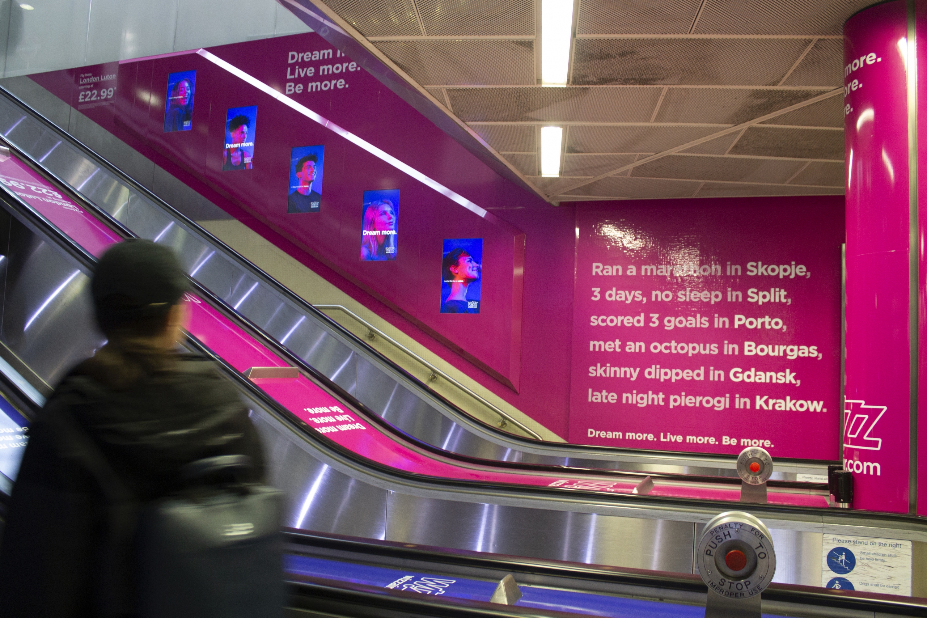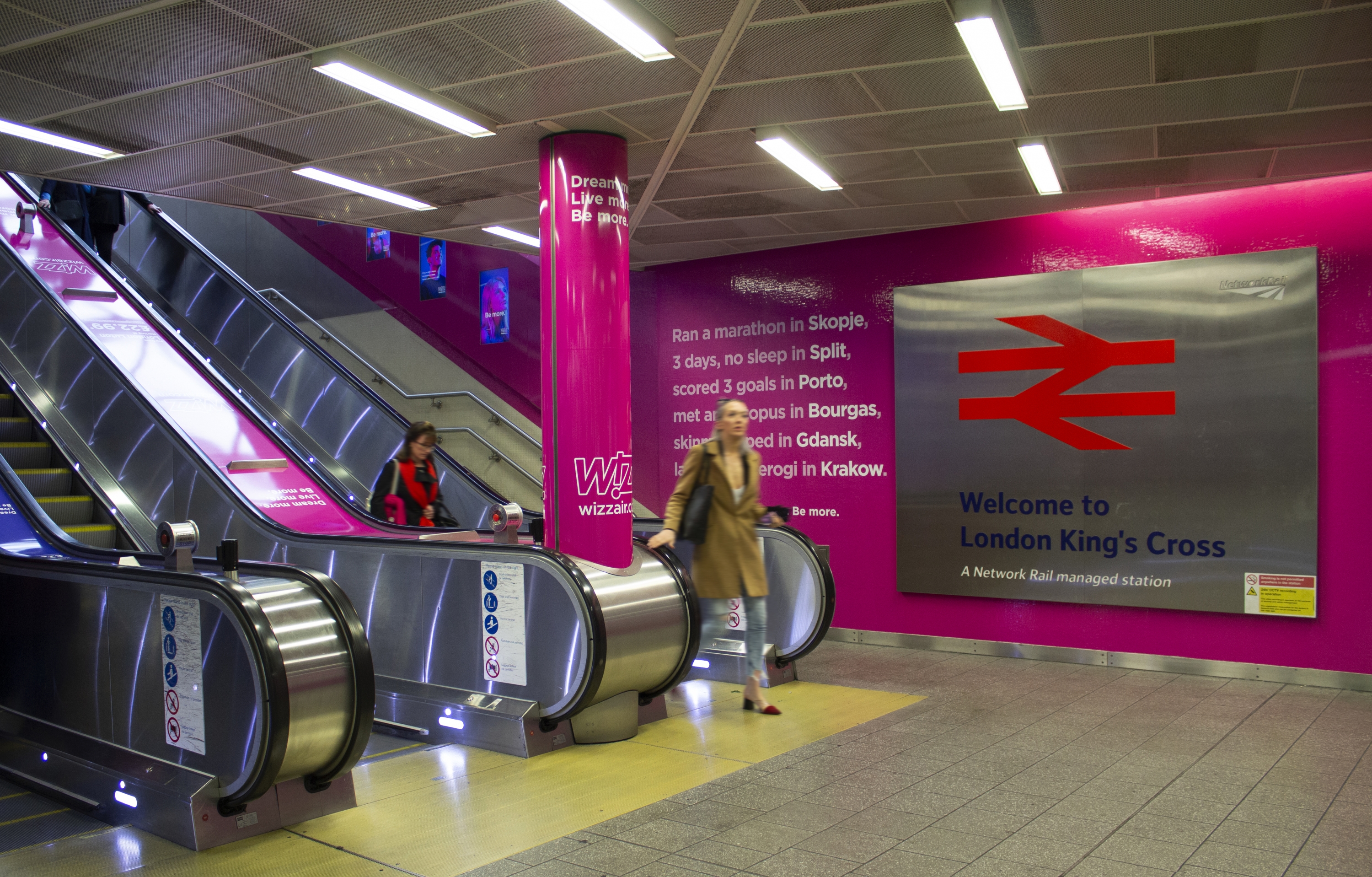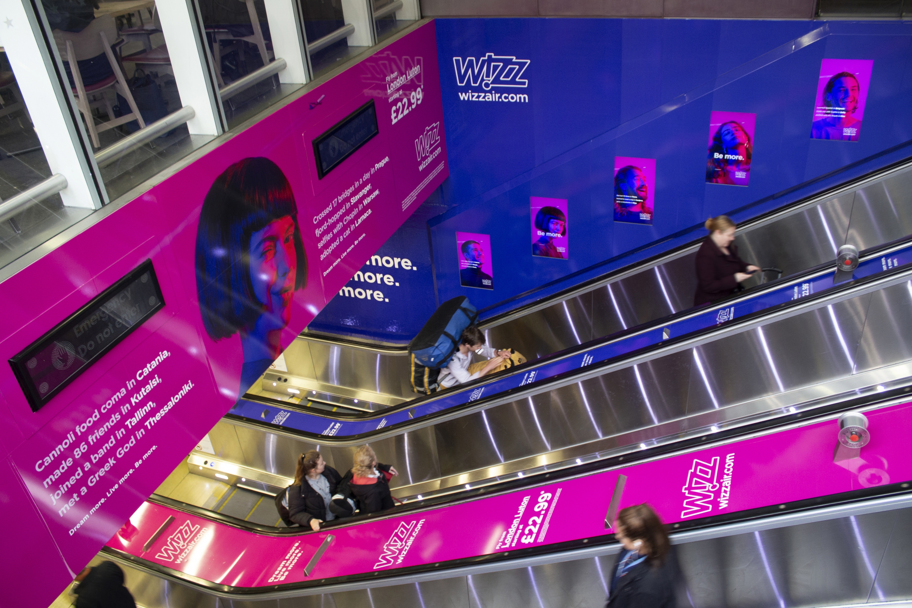 To promote Wizz Air's exclusive flight offers, the London King's Cross Immersion Zone was transformed. Eye-catching pink and blue vinyl covered the entire area, with prices and anecdotal case studies of people's holiday plans.