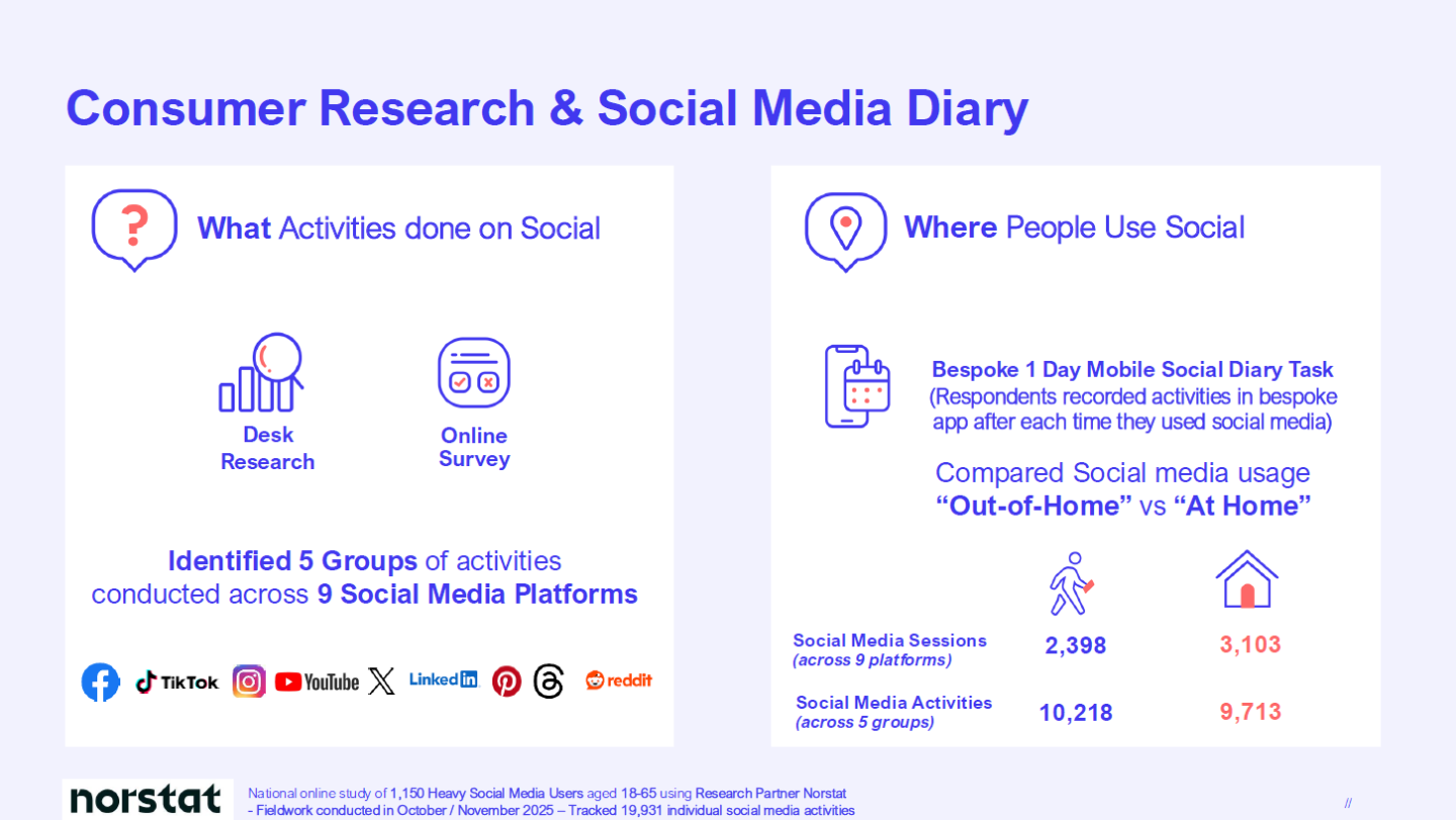 Survey/Mobile Diary task comparing at home vs out of home social media usage: A national online study of 1,150 Heavy Social Media Users aged 18-65 using Research Partner Norstat (Fieldwork conducted in October/November 2025)
