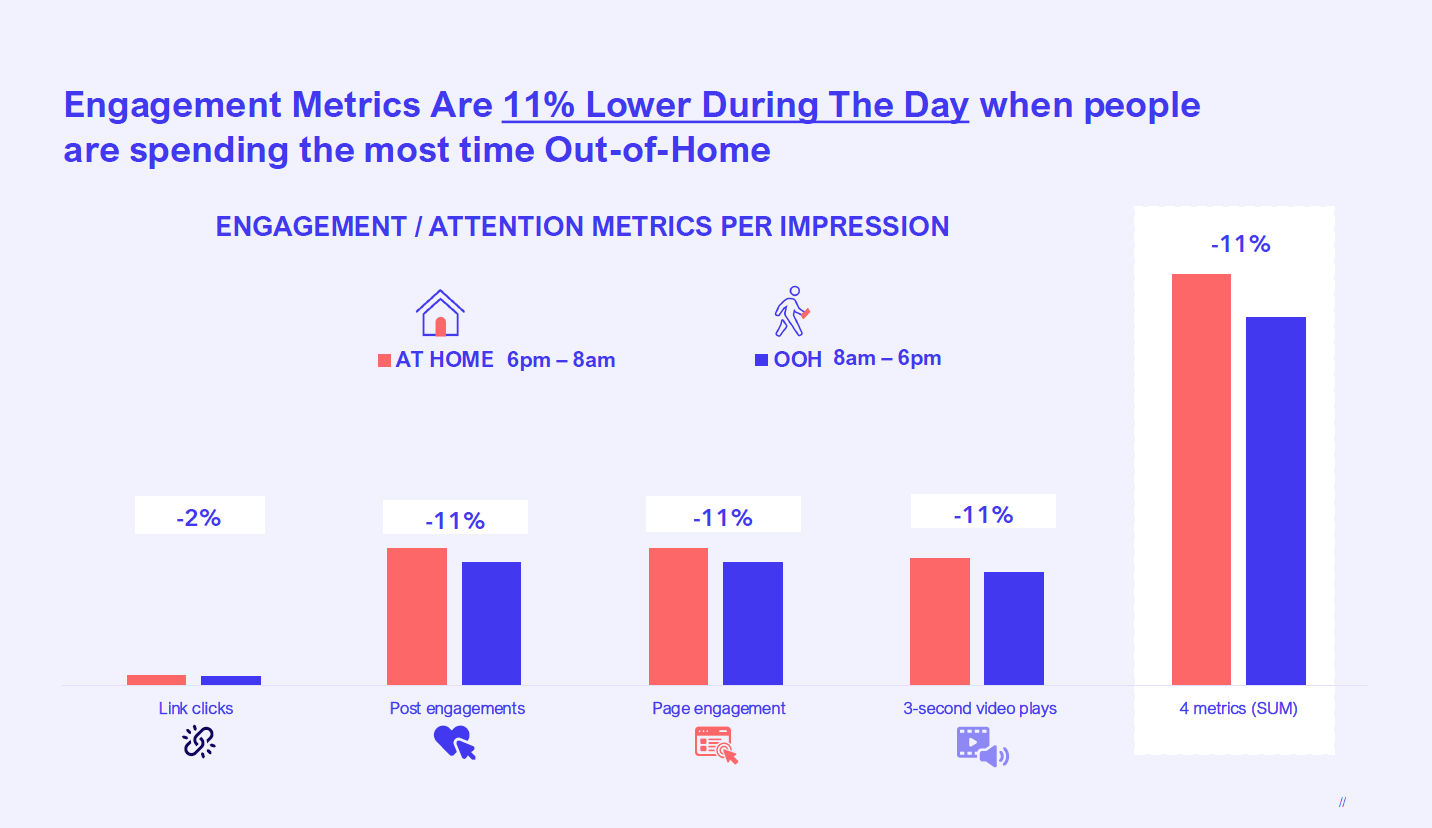 Analysis of social advertising impression and engagement data by time of day revealed a -11% daytime attention gap, largely due to daytime distractions and the more active and diverse social media behaviour when out of home.