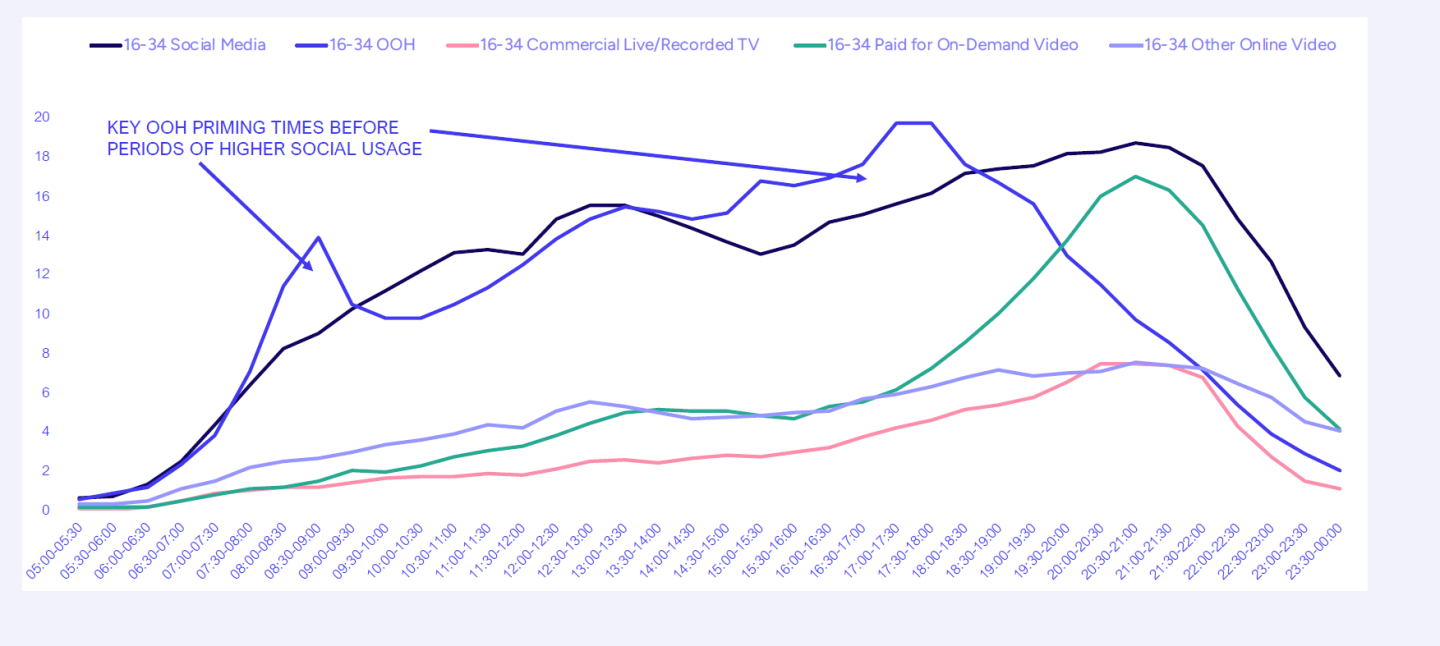 Out-of-Home and social media have a very strong dual screen synergy. Both are high reach channels and have a clear time of day synergy that is even stronger than AV channels, especially for the core 16-34 audience. There are also clear peaks in Out-of-Home exposure before peaks in social media usage, providing very well placed priming opportunities before subsequent social media ad exposure.